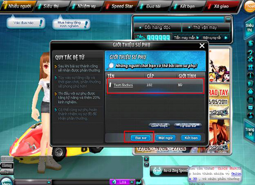 Thao tác: Ở phòng chờ chọn Xã giao -> Hệ thống sư đồ -> Bái sư, tìm cho mình một sư phụ bạn nhé!